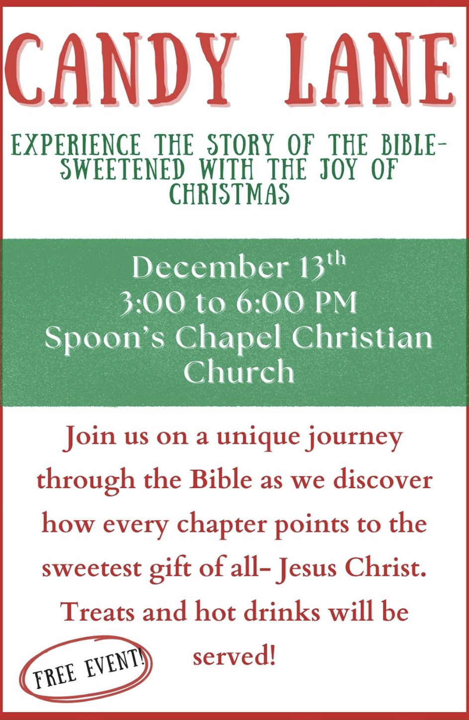 Think Trunk-or-Treat with a Christmas twist, journeying through a series of stations that follow the thread of Christ from Genesis through Acts. Come on out on December 13 between 3-6 P.M. (“open house” event) for Candy Lane, and help us celebrate the birth of our King!